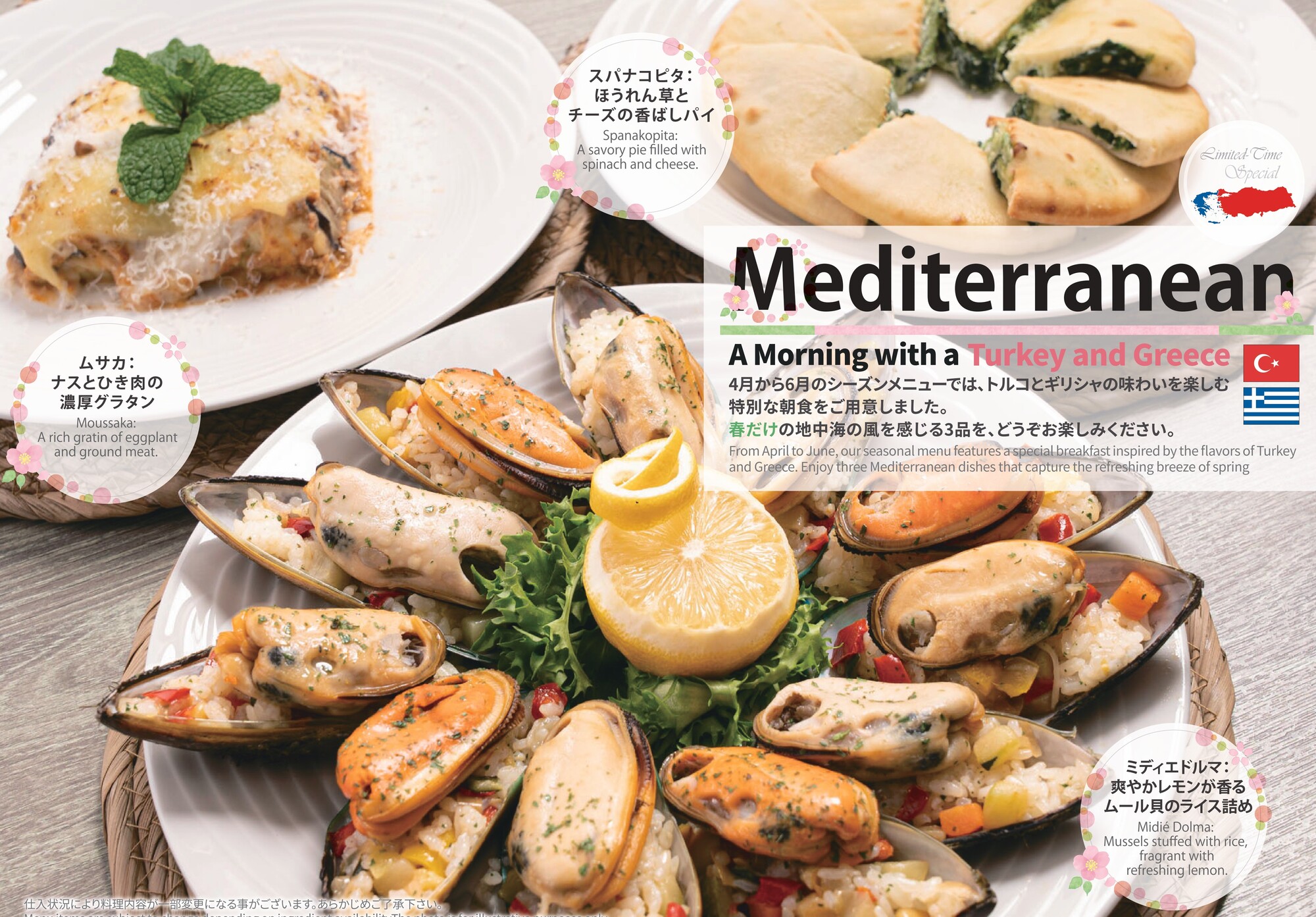 じゃらんアワード2年連続受賞の朝食ブッフェに、春の季節にぴったりな“地中海の恵み”を感じる特別メニューが登場。 オリーブやハーブが香るギリシャ、スパイス豊かなトルコの味わいを、旅気分でお楽しみください♪