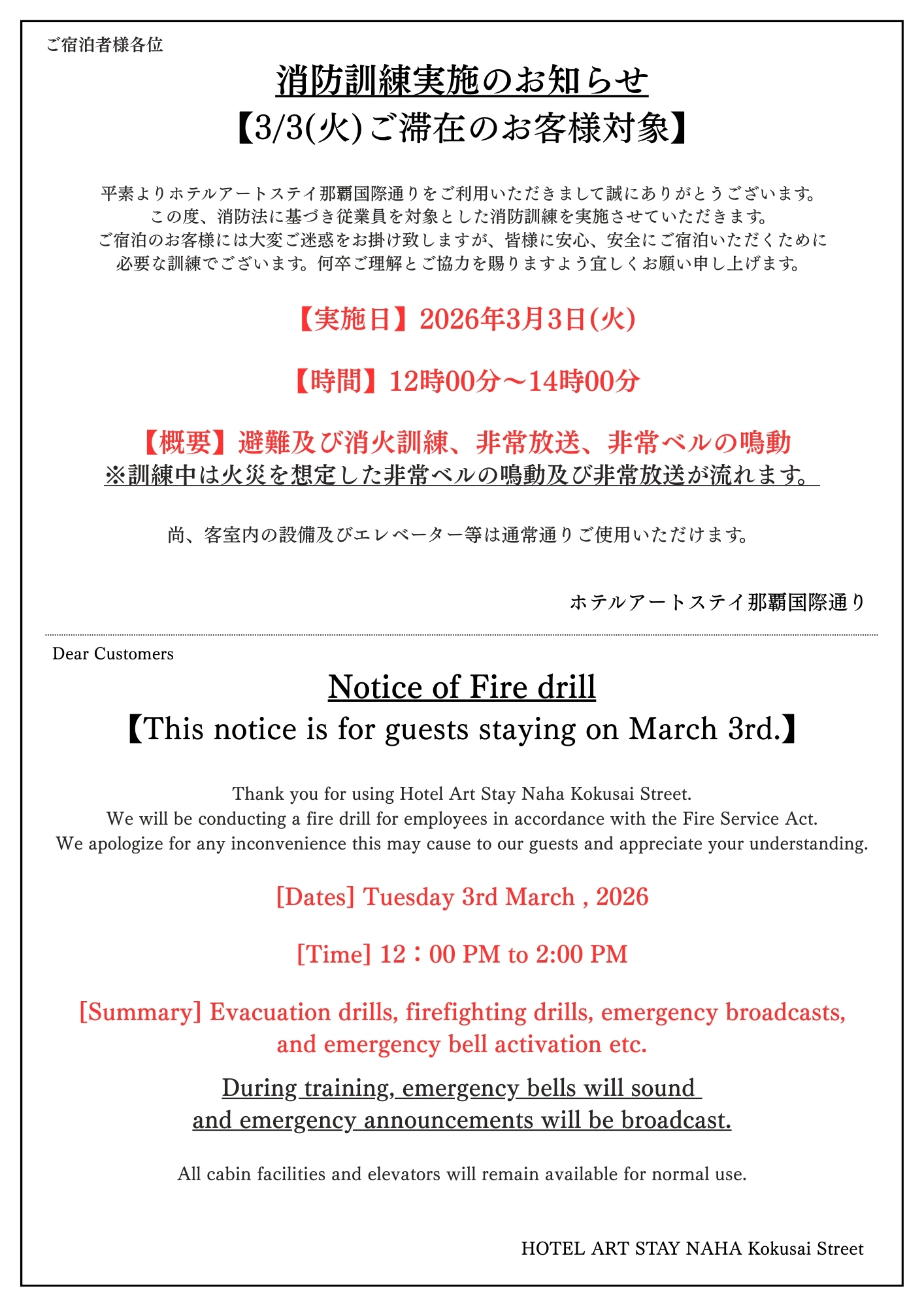 【2026年3月3日(火)】消防訓練実施のお知らせ