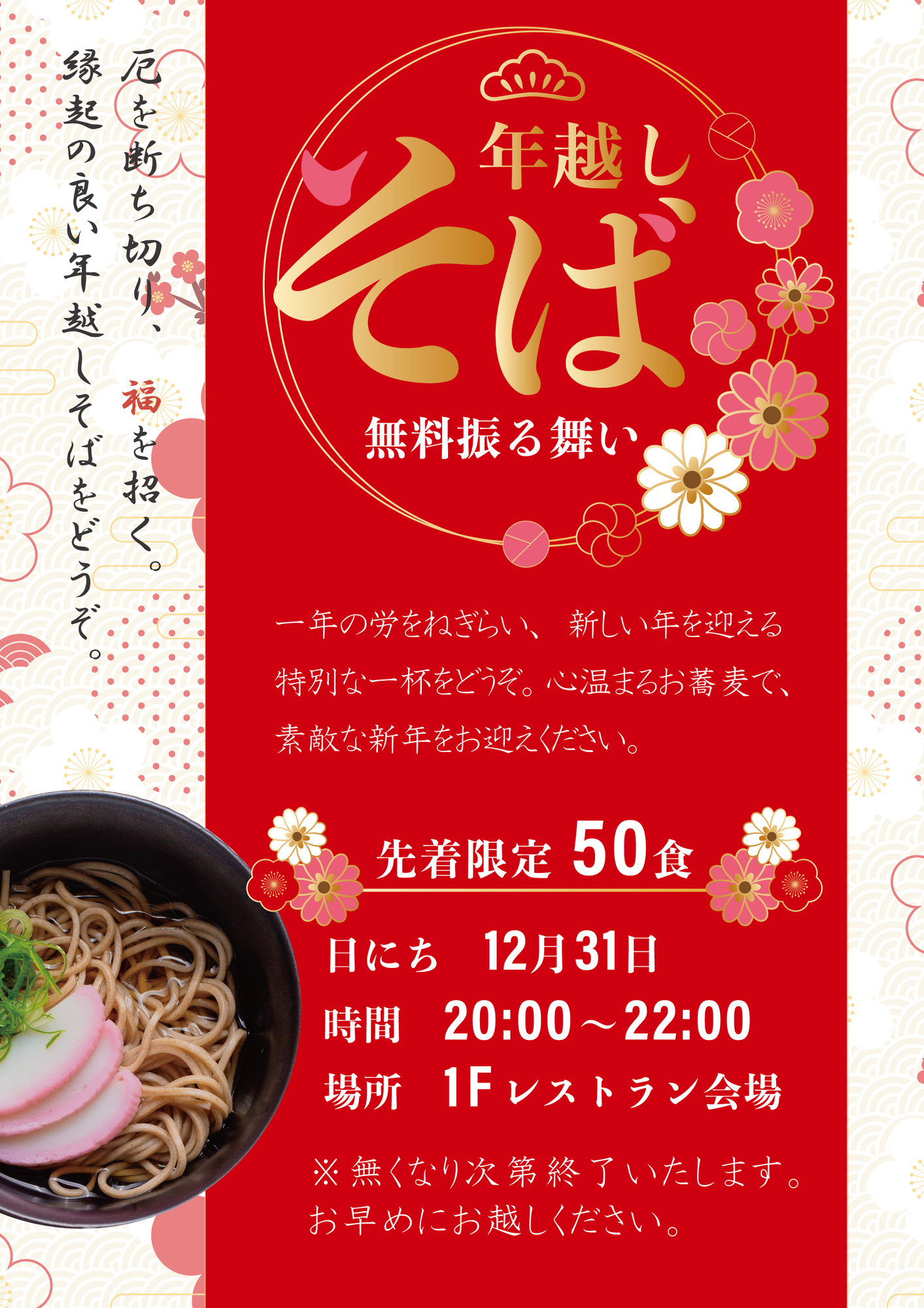 当ホテルでは、大晦日の夜に「年越しそば」の無料振る舞いを実施いたします。 一年の労をねぎらい、新しい年を迎える特別な一杯をどうぞ。