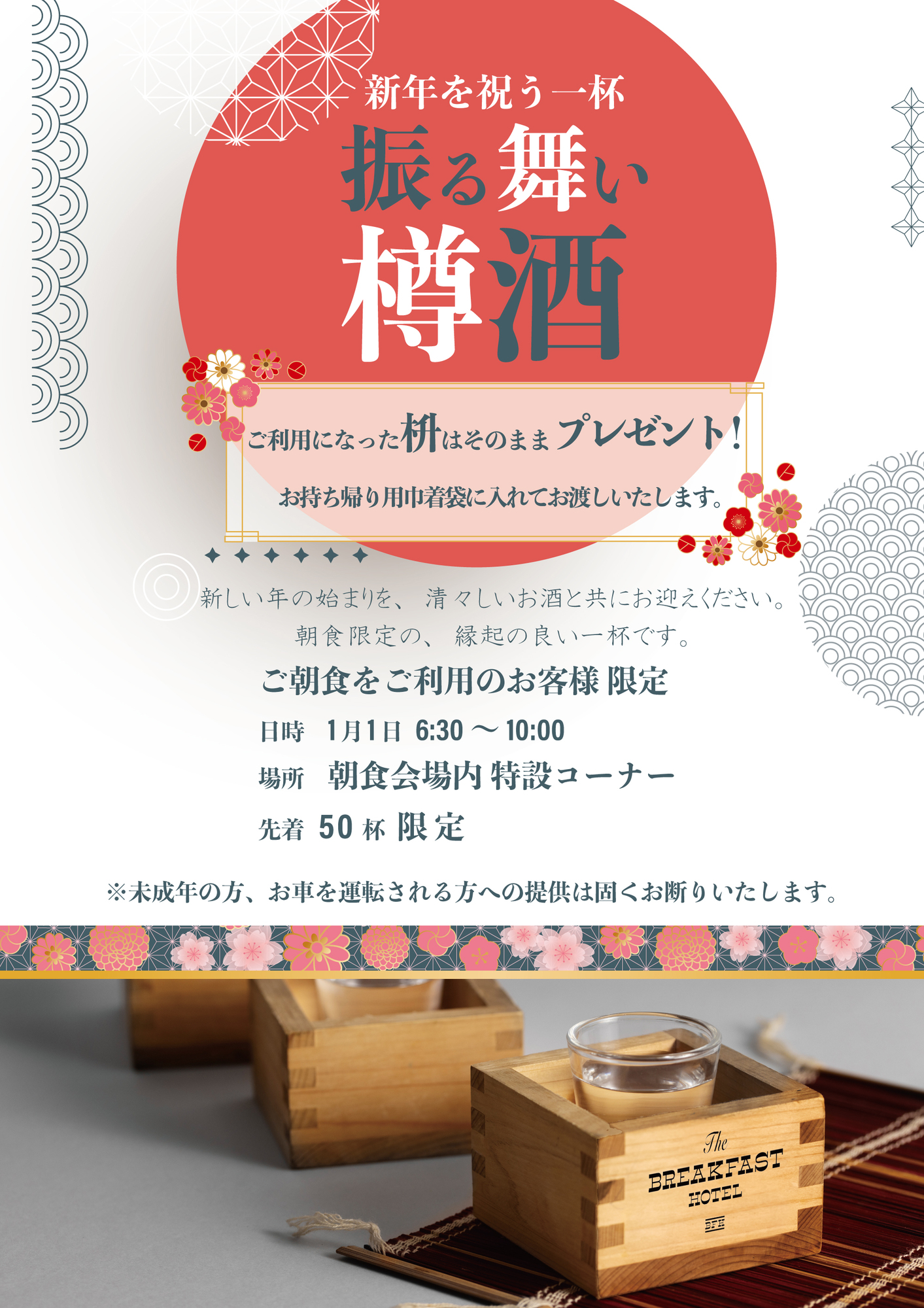 新しい一年の始まりを、清々しいお酒と共にお迎えいただきたく、ご朝食時に「新春振る舞い酒」を実施いたします。 朝食をご利用のお客様限定の、縁起の良い一杯です。