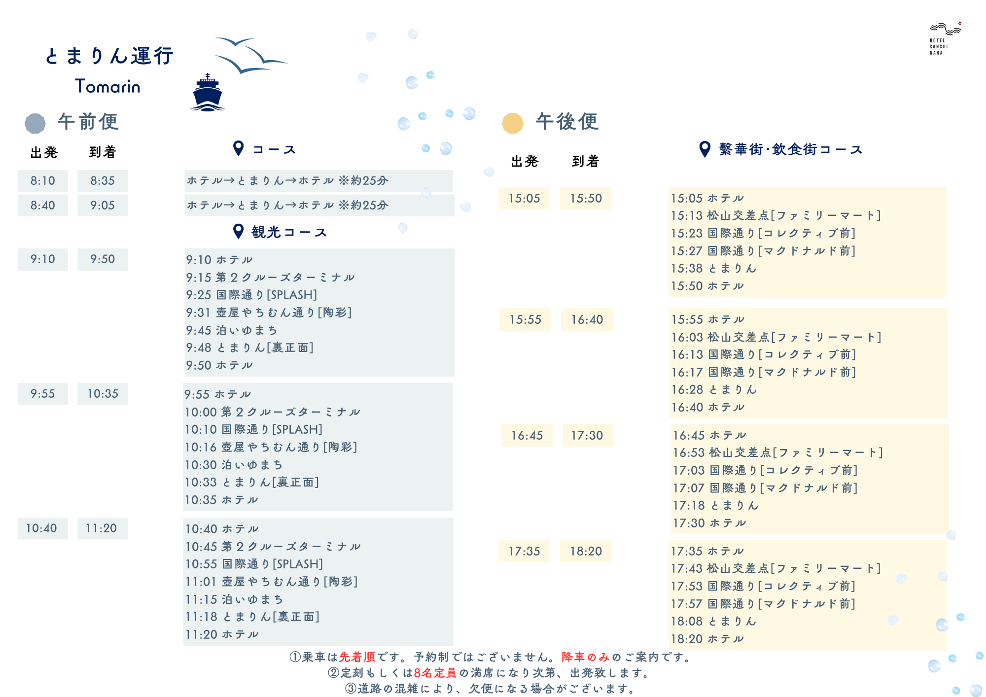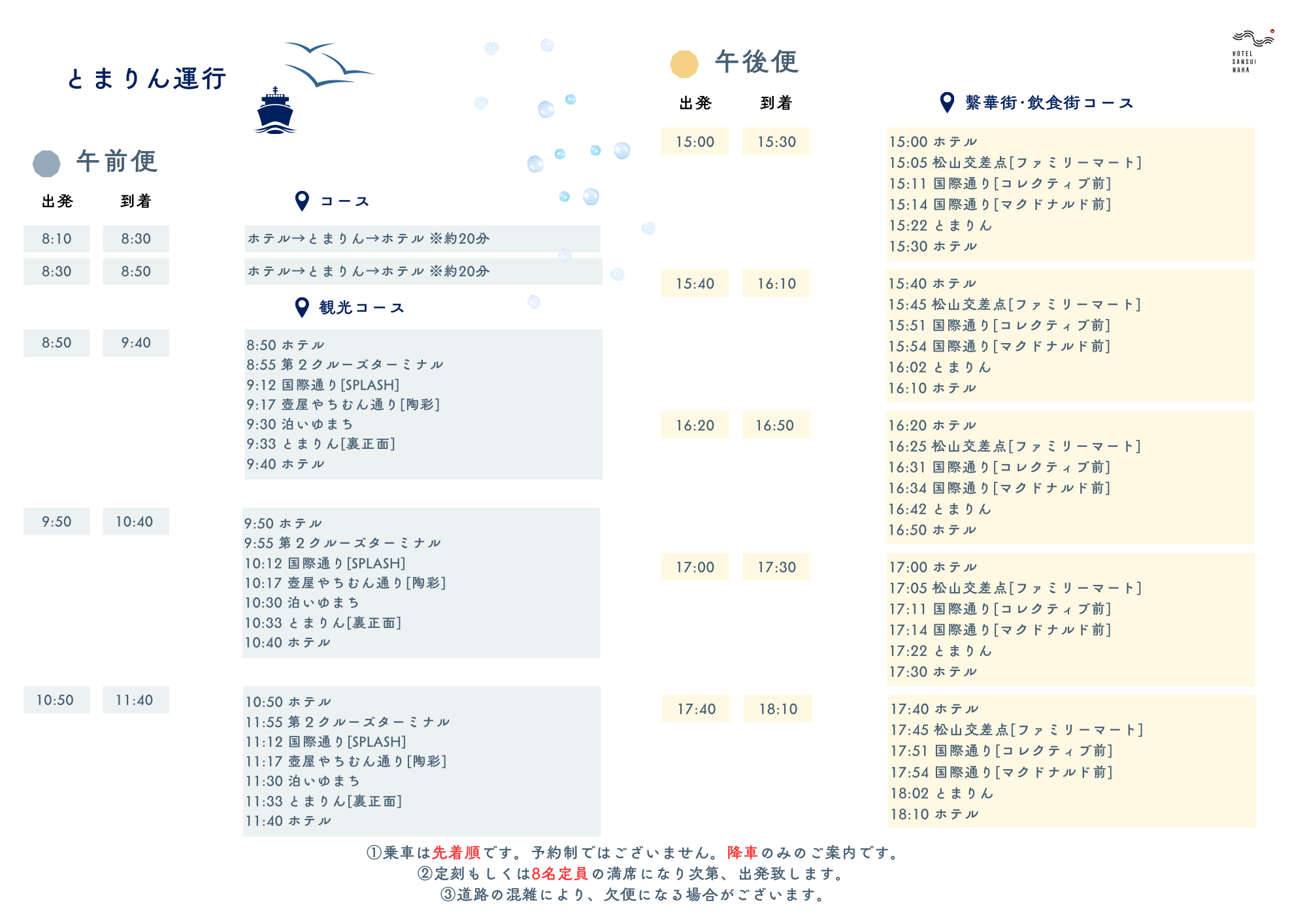 ①ご乗車は無料・先着順です。事前予約は承っておりません。ホテル以外は降車のみのご案内となります。