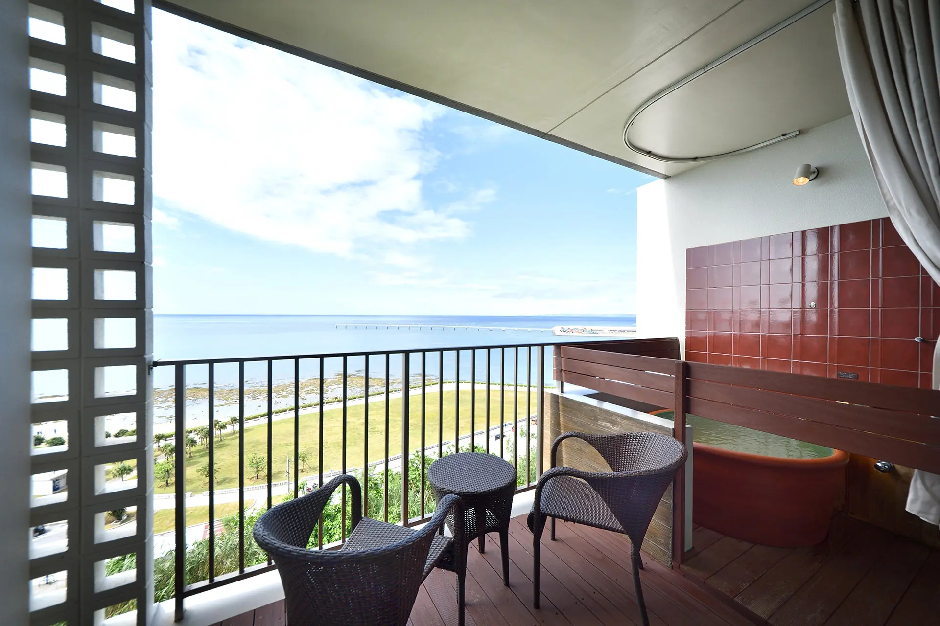 琉球畳をあしらって、足を伸ばしてゆったりとお寛ぎいただける和洋折衷のお部屋です。オーシャンビューでは東シナ海を一望でき、慶良間諸島に沈むサンセットにより刻々と変化する海の色彩も楽しめます。エアポートビューでは光り輝く街の夜景をバックにライトアップされた空港夜景をお楽しみ頂けます。